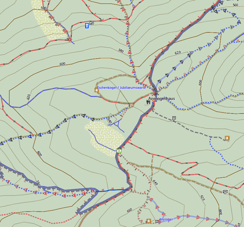 Note that the OpenMTBMap is a vector map that is drawn realtime on your PC/GPS. While raster maps are handdrawn and you would need one map for every resolution, vector maps are drawn realtime by your GPS/PC. This means that things like labels or density of streets/ways may be too much or too low. On the other hand vector maps are fully scalable, freely zoomable, rotatable (without letters being drawn upsidedown), autorouting capable, searchable, .... But hey, as you can see on the screenshots, the rendering quality is not far off from raster maps!